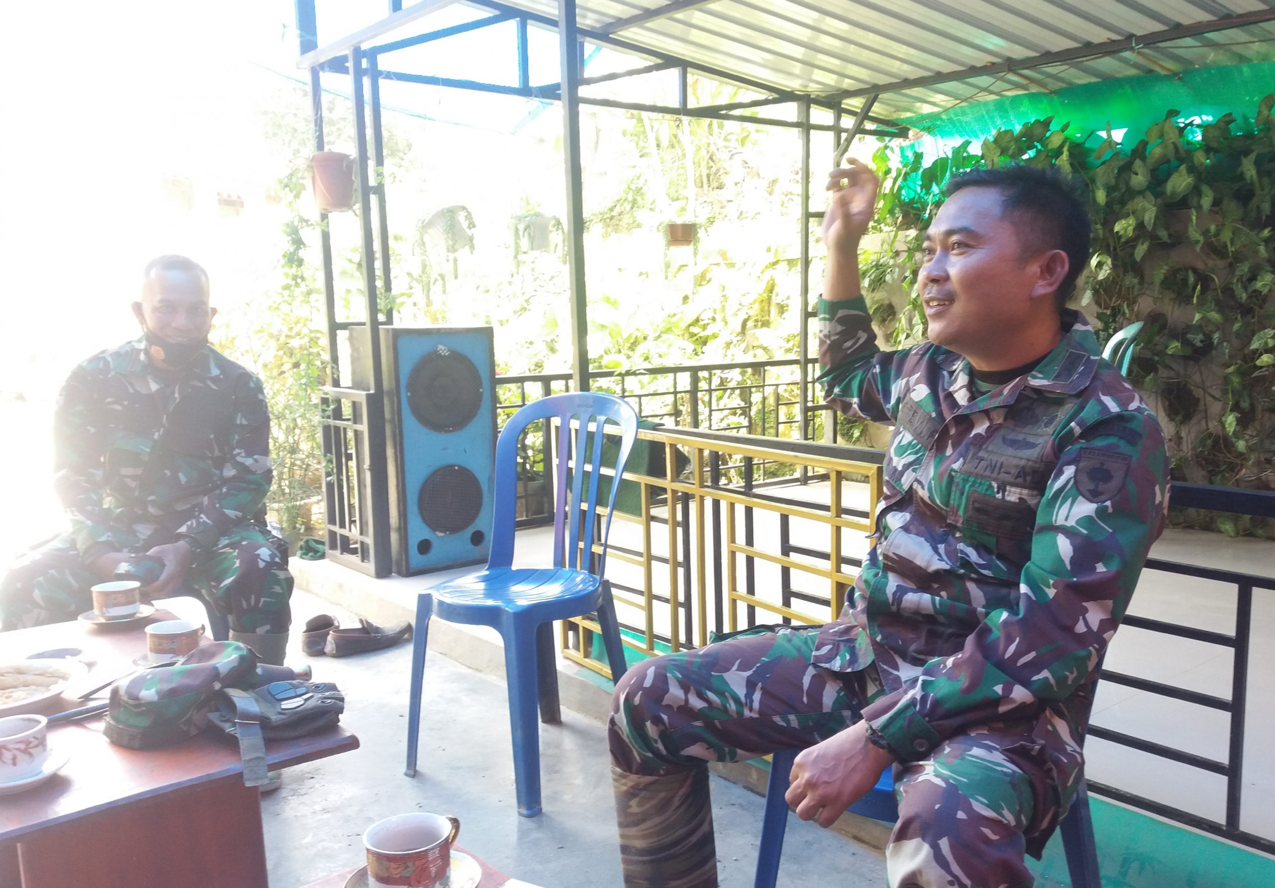 Kepala Desa Banea Thomas Tato bersama sejumlah warga dan prajurit TNI turut meramaikan diskusi ringan kemarin itu di beranda samping rumah Thomas.