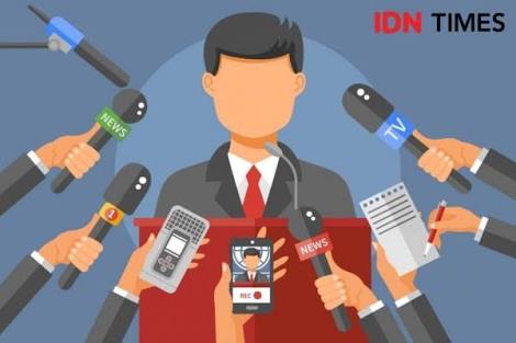 Para narasumber masih saling berdekatan dan para jurnalis berkerumun meliput acara. Padahal menjaga jarak sangat penting untuk menekan penularan virus corona.