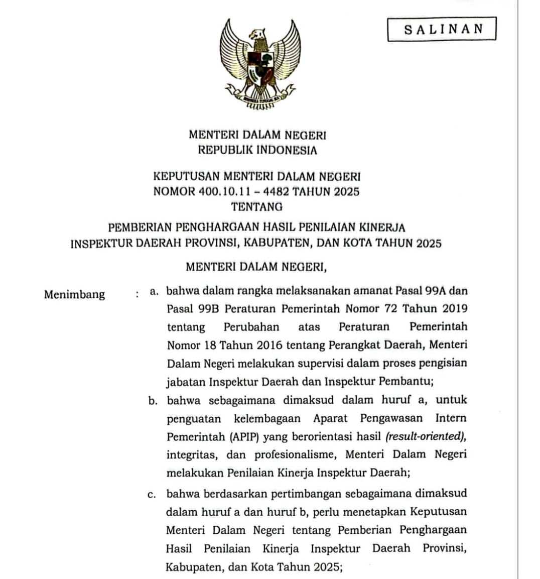 Capaian ini secara resmi tertuang dalam Surat Keputusan Menteri Dalam Negeri (Mendagri) Nomor 400.10.11-4483 Tahun 2025 tentang Pemberian Penghargaan Hasil Penilaian Kinerja Inspektur Daerah, Provinsi, Kabupaten, dan Kota Tahun 2025.