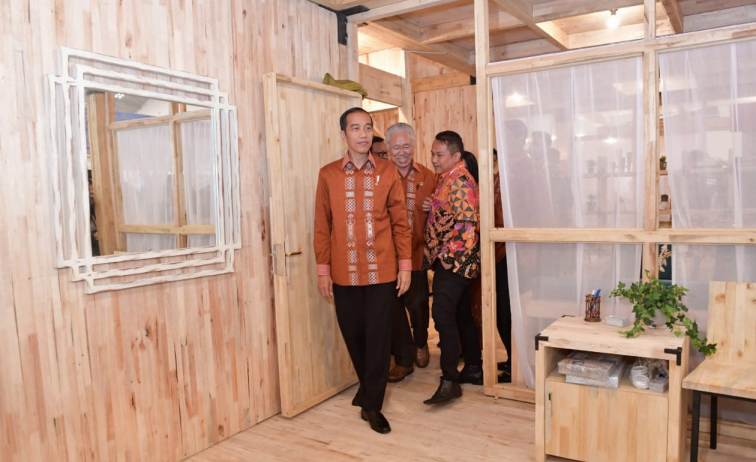 Di anjungan kayu ringan ini, Presiden yang didampingi Menteri Koordinator bidang Perekonomian Darmin Nasution, Menteri Perdagangan Enggartiasto Lukita, Kepala Badan Ekonomi Kreatif Triawan Munaf, dan Gubernur Banten Wahidin Halim, melihat beberapa furnitur yang juga terbuat dari kayu ringan. Bahkan, mereka tampak duduk bersama di sebuah meja makan. Obrolan ringan diselingi tawa memperlihatkan mereka menikmati suasana di anjungan tersebut.
