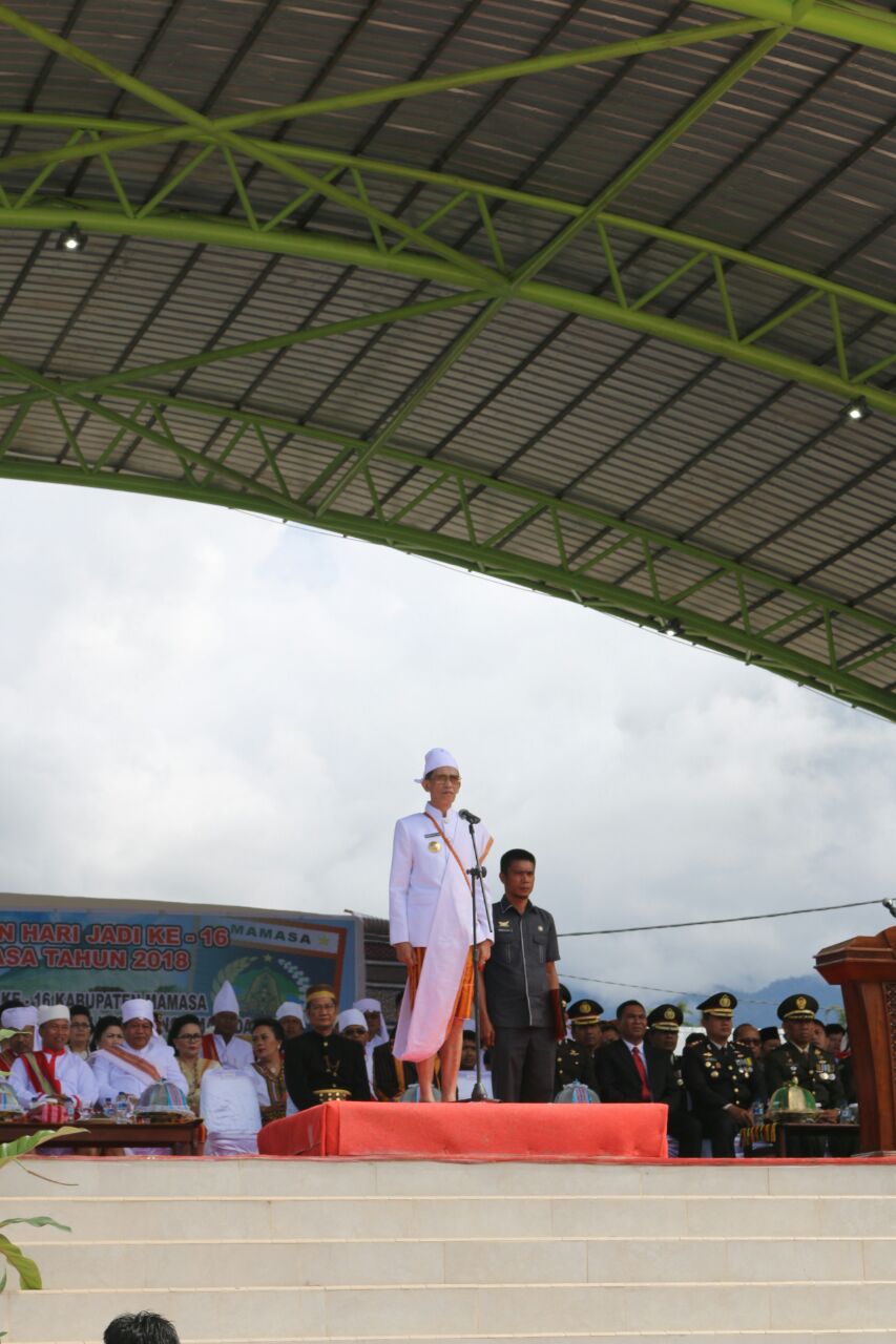 Plt. Bupati Mamasa Bonggalangi, selaku inspektur upacara menyampaikan, pada perayaan HUT Mamasa 2018, sangat tepat untuk mengevaluasi sejauh mana pembangunan yang sudah terlaksana dan yang belum dilaksanakan.